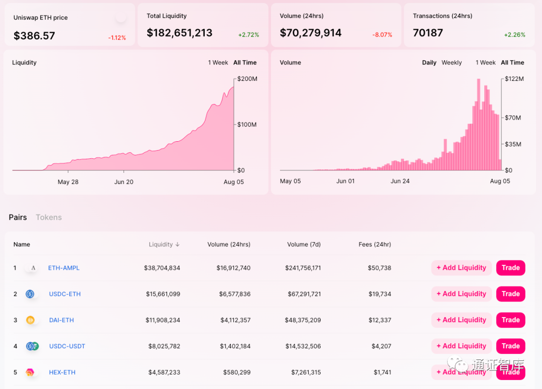 对于普通用户玩家来讲,把第一、二和Uniswap完全掌握好就可以比较顺畅的参与DeFi的这一场浪潮中了。在Uniswap平台可以进行买卖兑换的操作。Uniswap作为当前交易量最大的去中心化EX,每天的交易量可以达到1亿