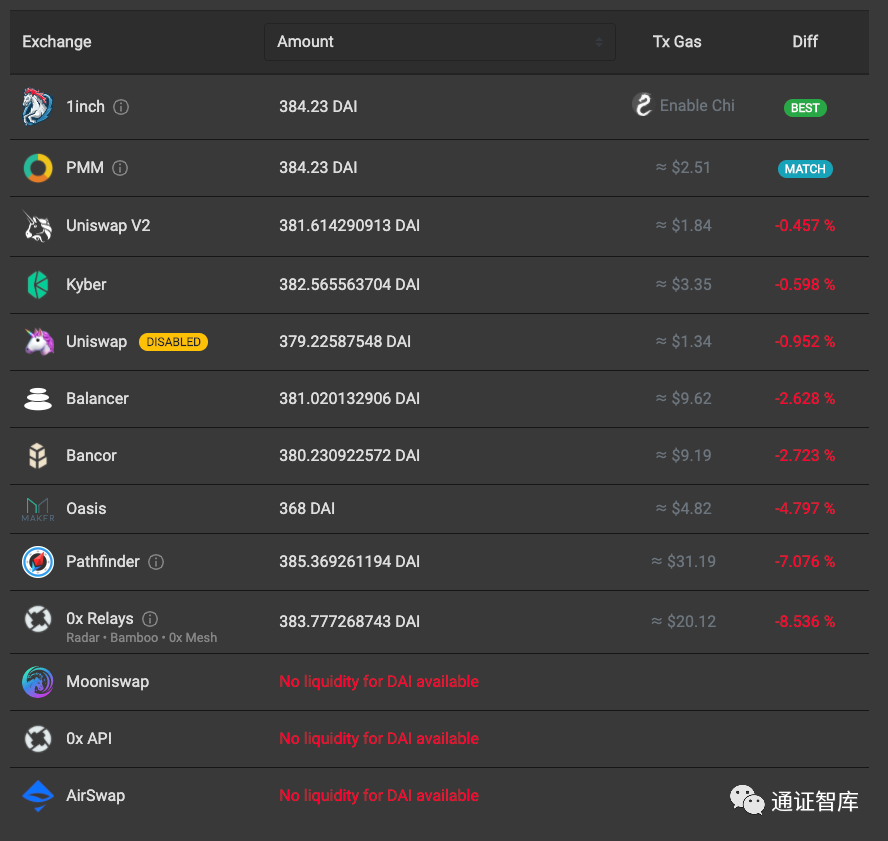 3、最佳策略聚合器(通过单个交易中在多个DEX之间拆分订单来获得最佳费率)地址:https://1inch.exchange