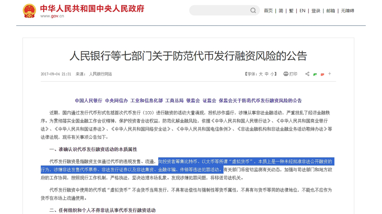 2017 年 9 月 4 日,中国人民银行宣布 ICO 为非法金融活动,要求相关交易所关闭。加密货币项目负责人被约谈后,市场对政府禁止加密货币的决心反应强烈,导致价格暴跌。北京监管要求 15 日 24:00 前关闭交易所,14 日 binance BTC 跌超 20%,15 日跌至 $2,817。