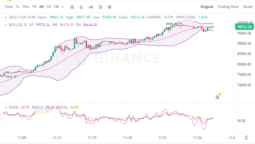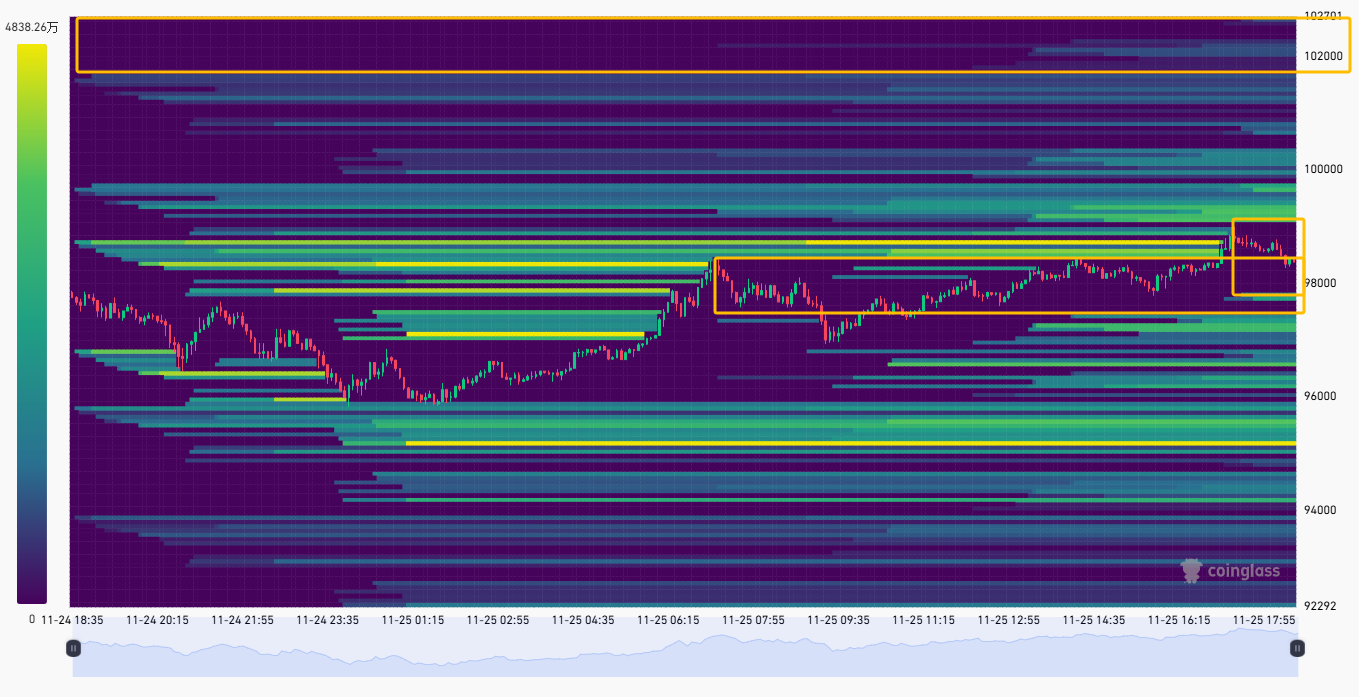 尽管比特币表现亮眼,但仍未突破 10 万美元大关。目前这一里程碑附近存在强劲阻力,频现抛售压力。交易者在 99,000 至 99,500 美元区间运用"诱空"等复杂策略操作。这些策略加上长期持有者的获利了结,导致比特币在 98,000 美元附近盘整。以下是 Binance 的合约清算热力图,能看到在 10 万附近和 9.8 万附近,清算强大最高。