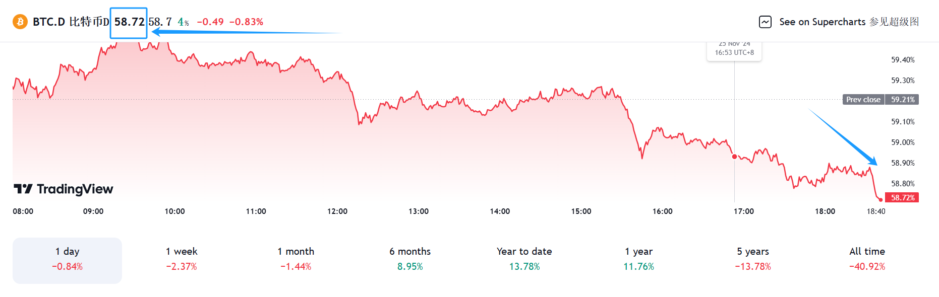 加密市场在比特币主导期和"山寨币季节"(山寨币跑赢比特币)之间循环。比特币主导指数(BTC.D)和历史模式预示可能出现转变。BTC.D 计算方法是用比特币市值除以前 125 个山寨币的总市值,然后乘以 100,目前在降低,BTC.D 是 58.73%。