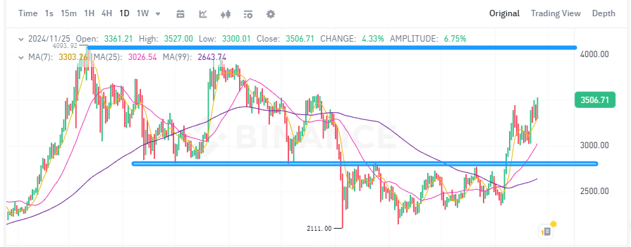 以太坊:ETH 维持在 2,800 美元支撑位之上,接近 4,000 美元阻力位。