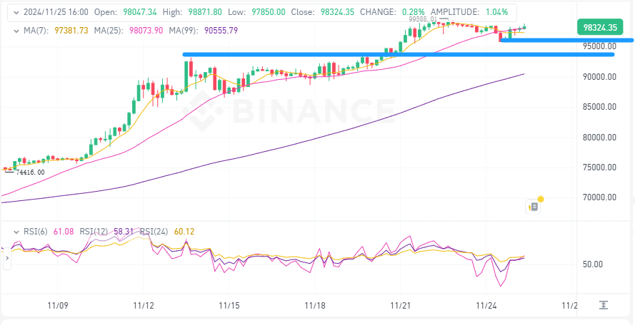 5 天来,比特币在 98,000 美元附近盘整(Binance 价格),未攻破 10 万美元防线。据 CryptoQuant 数据,仅在 22 日当天看涨用户就进行了 4.43 亿美元的获利交割。在 BTC 大幅上涨并接近 10 万美元里程碑后,加密市场似乎进入了巩固阶段。