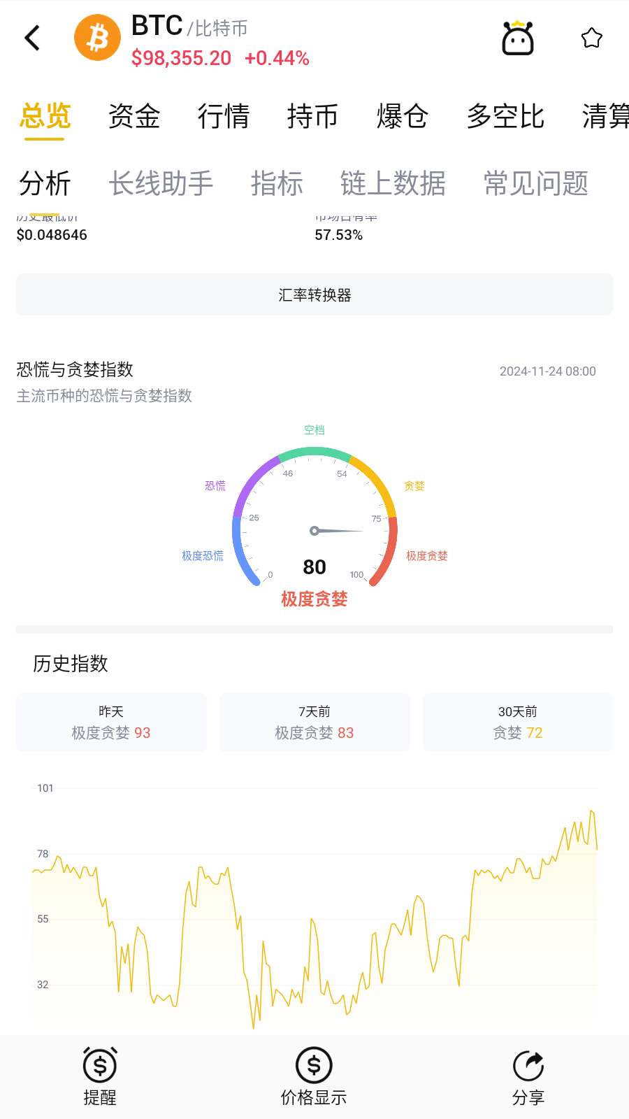 恐惧和贪婪指数保持在比特币的"极度贪婪"区间,显示看涨情绪强烈,同时引发对可能超涨的担忧。
